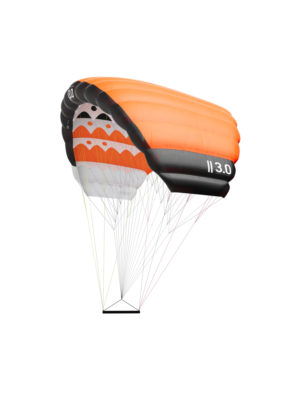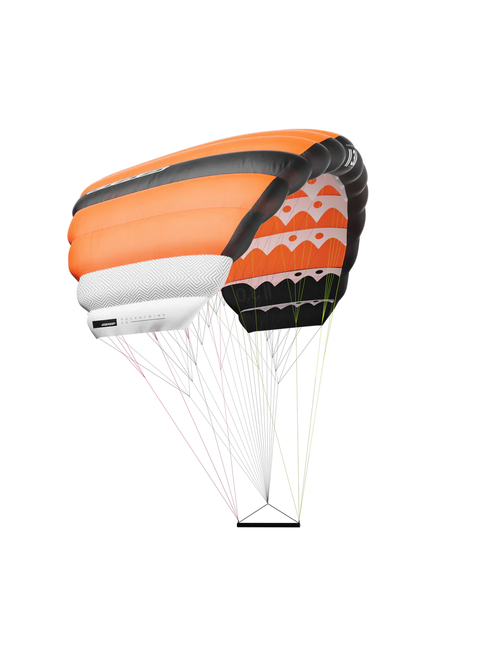 RRD POCKET WING on valmistatud ülikergest 32 g/m² nailonkangast ning varustatud Dineema SK99 liinidega kolmes eristavas värvitoonis, et oleks lihtne tuvastada bridli süsteemi osi: oranž eesmine (A), sinine keskmine (B) ja kollane tagumine (C) osa.